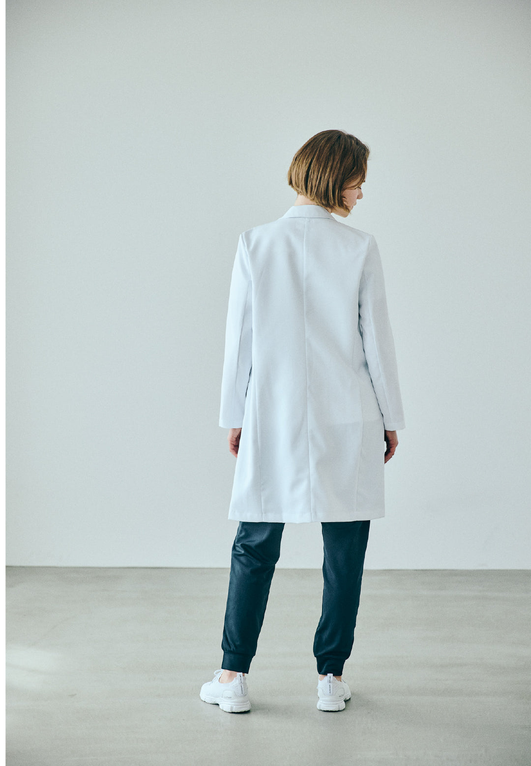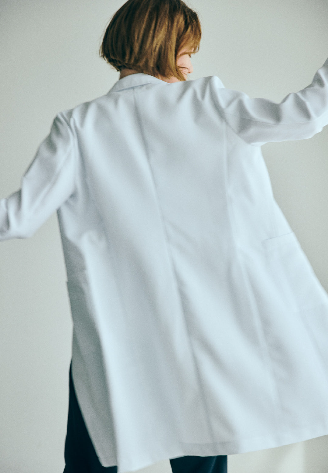 細めのラペル(襟)と、低めに設定した第一ボタンがスタイリッシュな印象を演出。ウエストをほどよく絞り、裾に向かって広がるXラインを採用することで、縦長効果を高め、女性らしい美しいシルエットを実現しました。