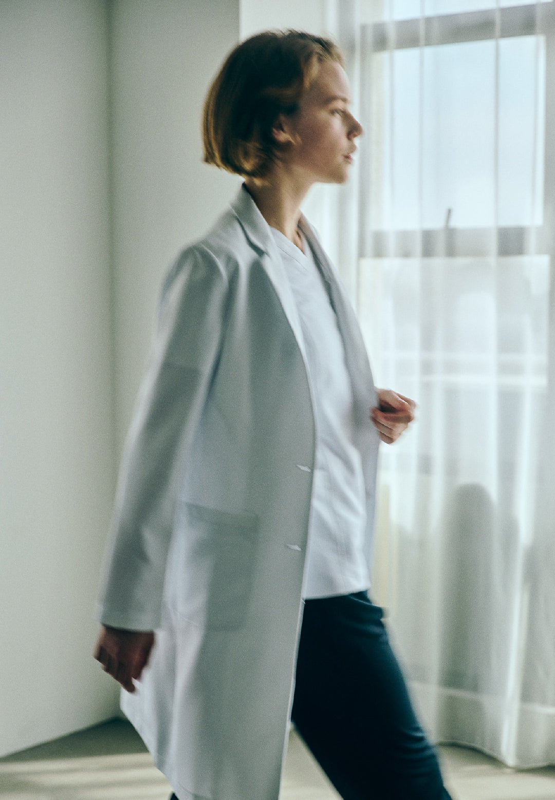 機能性にもこだわり、アウトポケットは聴診器が入る大容量デザイン。さらに、ご自宅で手軽に丸洗いできるため、お手入れも簡単です。