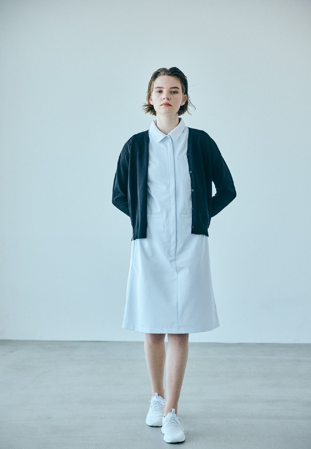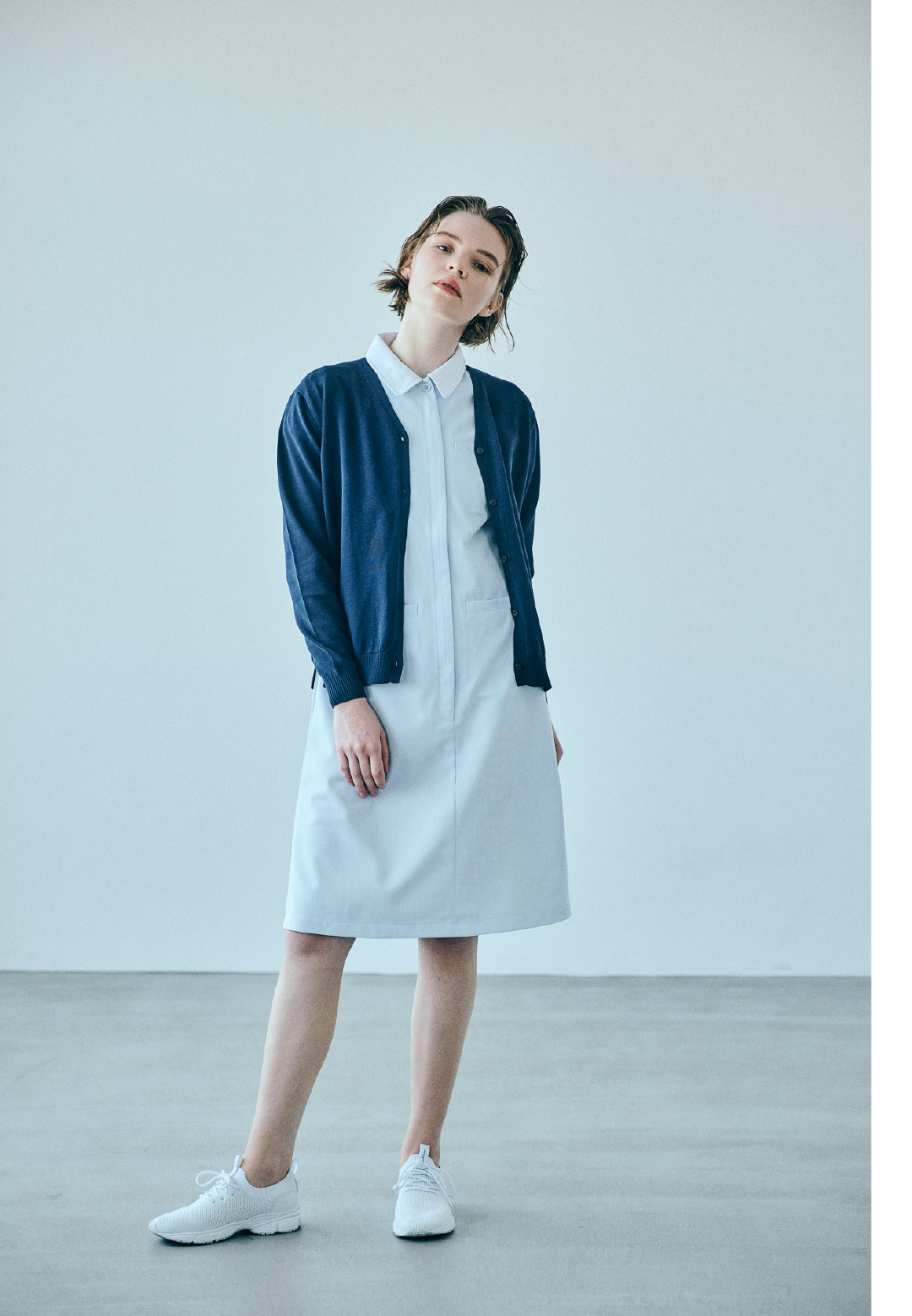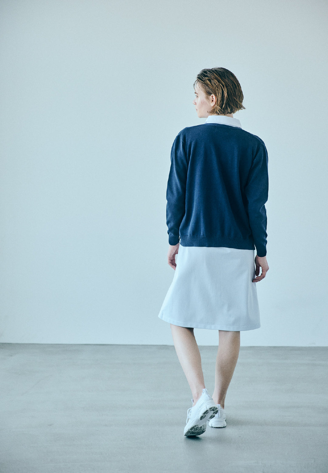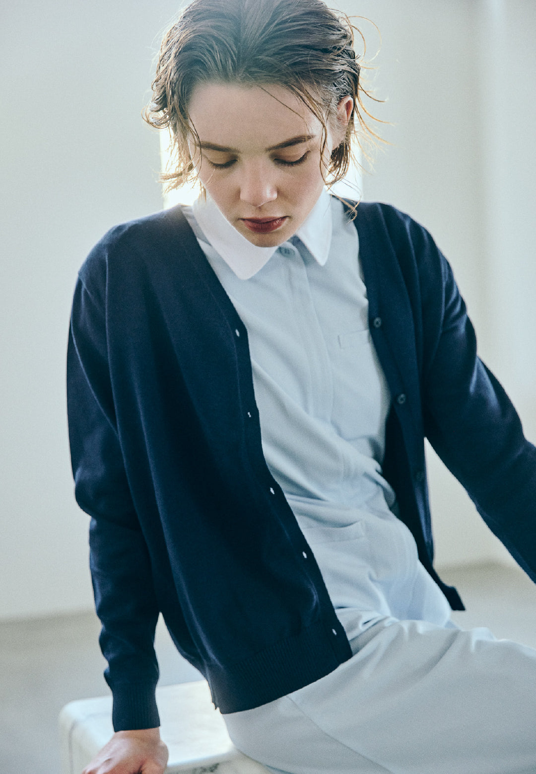 短めの丈感が、ウエスト位置を高く見せてスタイルを美しく演出。袖は少し長めに設計されており、手元を華奢に見せる効果もあります。
